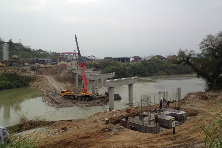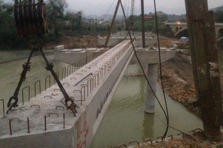 下午16時(shí)30分,公司下屬機(jī)械分公司副經(jīng)理朱超群、該項(xiàng)目部經(jīng)理汪承亮下達(dá)開始架梁的命令?,F(xiàn)場頓時(shí)掌聲雷動(dòng),禮花飛舞。在雙滑輪組的勻速滑輪中,空心板梁被緩緩?fù)扑偷轿?,徐徐降落固定,?jīng)過近40分鐘的精心操作,S347炎陵石潮至壟下公路新河漠大橋4#-5#墩5-3#空心板中梁順利架設(shè)成功。