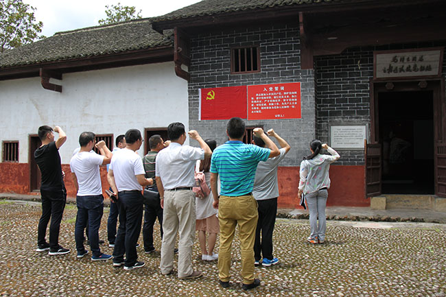 隨后,一行人到達(dá)水口鎮(zhèn)連隊(duì)建黨舊址。水口鎮(zhèn)連隊(duì)建黨舊址——葉家祠1972年被公布為湖南省重點(diǎn)文物保護(hù)單位,已被定為株洲市愛國主義教育基地。祠堂門口懸掛著鮮明的黨旗及入黨誓詞,肅穆莊嚴(yán),公司黨員在此重新宣讀入黨誓詞,內(nèi)心激動(dòng)澎湃的感情溢于言表。誓詞提醒著每一位黨員的承諾與信仰,他們將牢記自己的使命,從群眾中來到群眾中去,發(fā)揮黨員帶頭作用。
